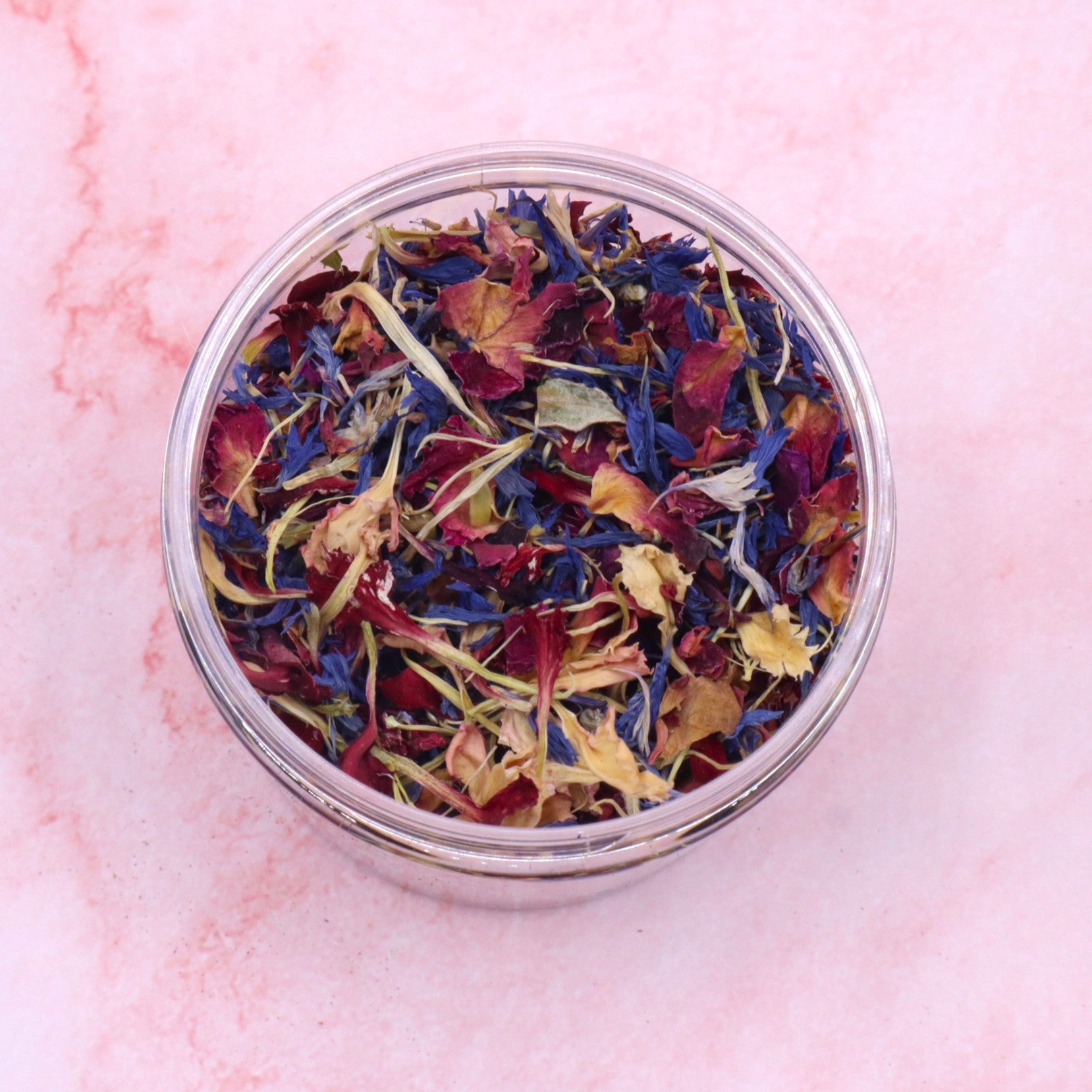 Deze sprinkle bevat gedroogde bloemblaadjes in de kleuren roze, rood en blauw van de bloemblaadjes van de roos, anjer en korenbloem.